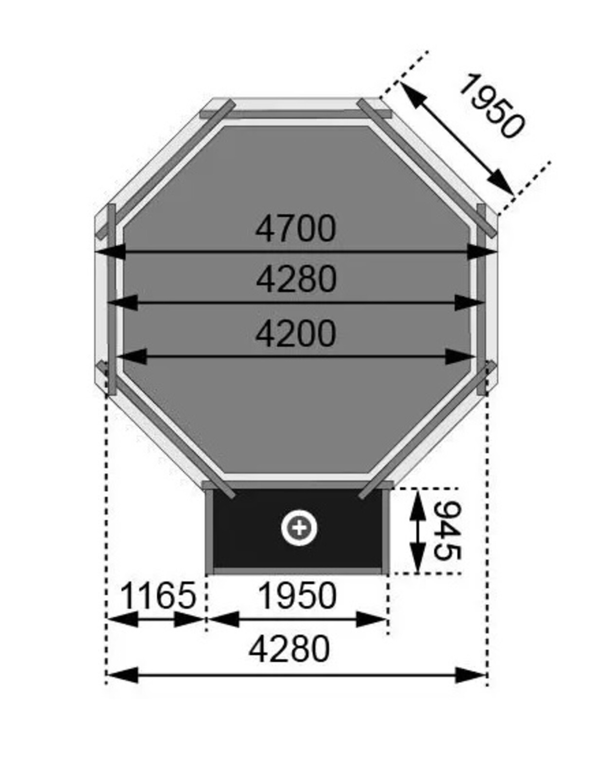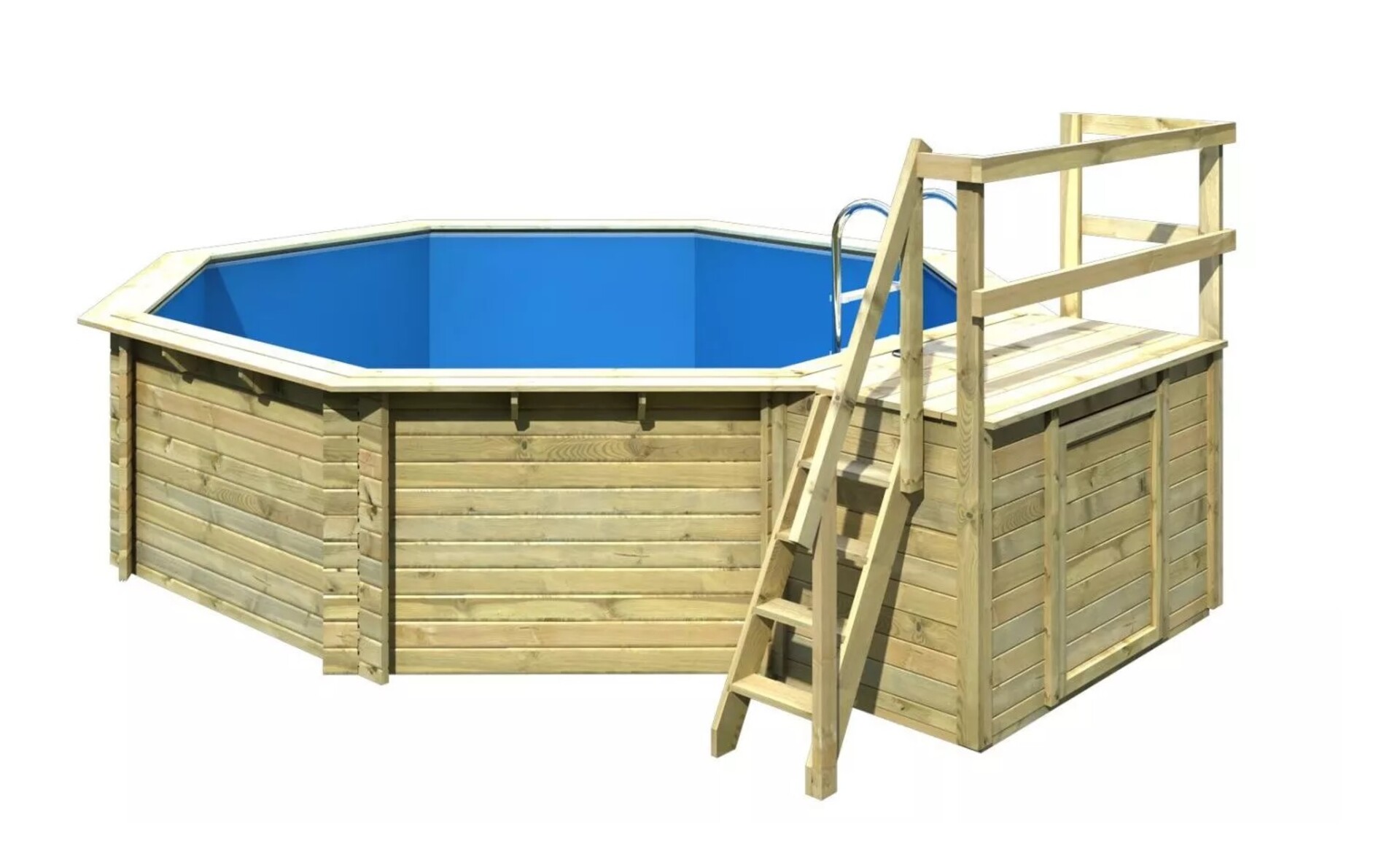 Bazén má objem pro cca 16 000 litrů vody a výšku hladiny max. 111 cm. Vnější dřevěný žebřík ze severského smrku a vnitřní žebřík z nerezové oceli vám usnadní vstup do chladné vody (obojí je obsahem základního balení). Díky svým rozměrům 550 x 470 cm zábavu a hry pro celou rodinu.