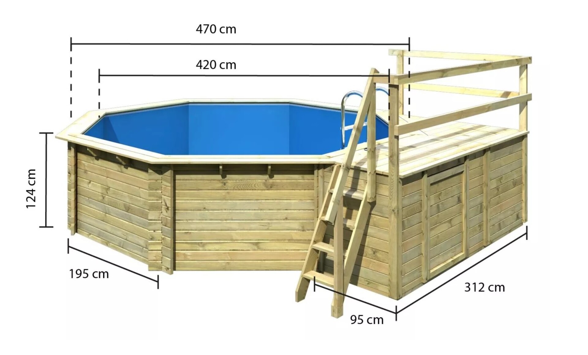 Bazén má objem pro cca 16 000 litrů vody a výšku hladiny max. 111 cm. Vnější dřevěný žebřík ze severského smrku a vnější žebřík z nerezové oceli vám usnadní vstup do chladné vody (obojí je obsahem základního balení). Díky svým rozměrům 550 x 470 cm zábavu a hry pro celou rodinu.