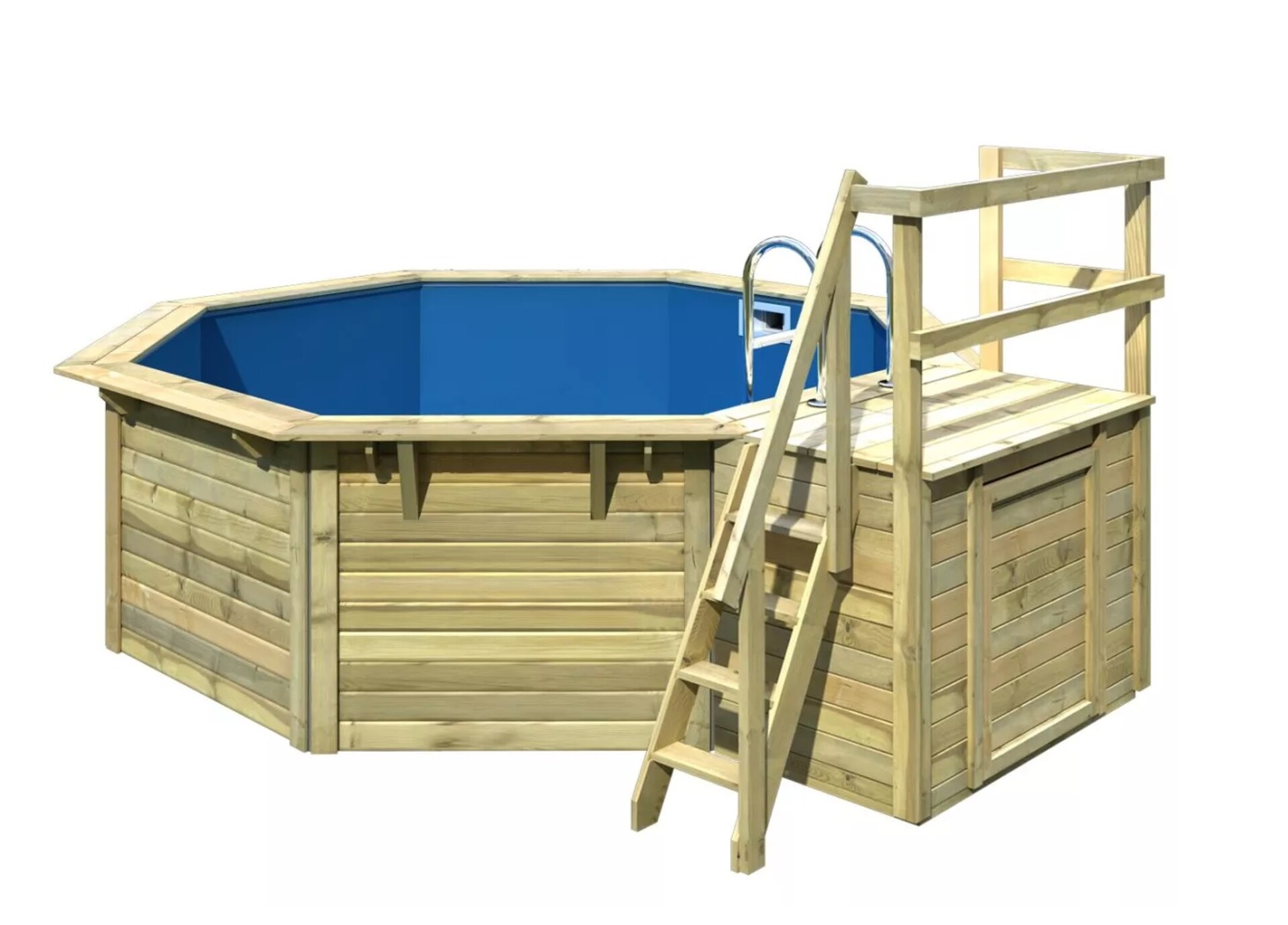 Konstrukce bazénu je vyrobena z dřevěných profilů (systém dvojité pero / drážka) síly 38 mm. Vnitřní prostor je vyplněn pevnou modrou PVC fólií o síle 0,6 mm.