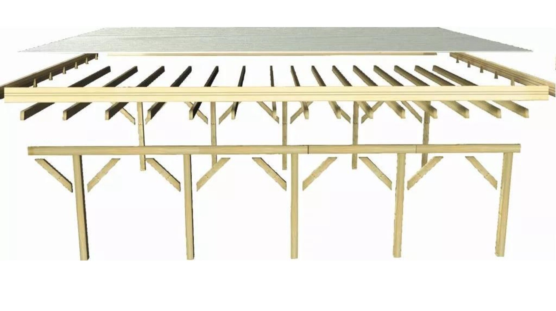 Přístřešek na auto - obdélníkový tvar a svými rozměry vyhovuje většině modelů vozidel běžných na českém trhu. Celková zastřešená plocha je 3,18 x 6,70 m. Průjezdná výška je 206 cm. Střechu podpírá osm dřevěných sloupků 11,5 x 11,5 cm. Konstrukce přístřešku je tlakově impregnována a je tak dobře chráněna proti dřevokazným houbám i hmyzu, ale i proti nepříznivým povětrnostním podmínkám. Impregnace je zdravotně nezávadná a naprosto bezpečná. Vzhledem k velkým plochám střechy a zatížení větrem je nutné připevnit přístřešek k zemi pomocí odpovídajících zemních kotev (nejsou obsahem dodávky - lze dokoupit jako příplatkové příslušenství).