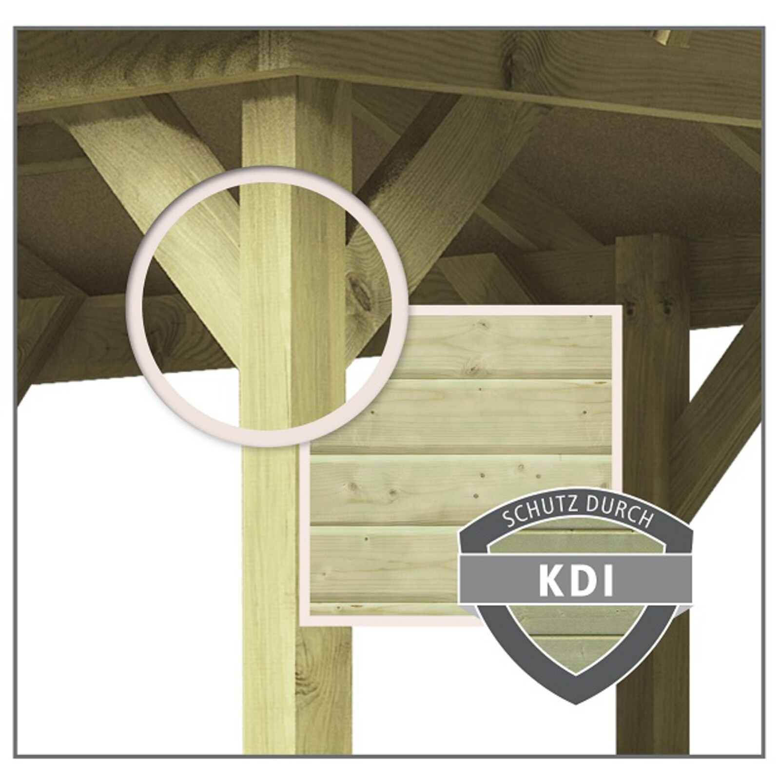 - Při výrobě konstrukce bylo použito tlakově impregnované dřevo. Jedná se o velmi účinnou a ekologicky šetrnou metodu pro ochranu dřeva. Zředěné impregnační soli se vysokým tlakem v průmyslové přetlakové komoře vtlačují do vnitřní struktury dřeva, takže ošetřené dřevo má na konci tohoto procesu vysokou vlhkost a velmi pomalu vysychá. Proto má tlakově impregnované dřevo specifické vlastnosti, především typickou nazelenalou, načervenalou, namodralou nebo našedlou barvu. Na povrchu dřeva mohou být často malé šedivé / zelenkavé / bílé skvrny. Často se to nejprve klasifikuje jako plíseň. Většinou se jedná o neškodné krystaly soli, které se na povrchu kombinují s pryskyřičnými složkami ze dřeva. Tyto body časem zmizí a stanou se nepoznatelnými. Krystaly soli na povrchu jsou považovány za kvalitativní znak pečlivé tlakové impregnace. Větší černé tečky už mohou být opravdu plísní, která může lehce vzniknout při skladování impregnovaného dřeva v uzavřených prostorách nebo při nedostatečné ventilaci. K jejich odstranění často stačí vykartáčování. Silně postižené oblasti vydrhněte domácím čisticím prostředkem obsahujícím chlór. Plísňové tečky jsou pouze na povrchu dřeva a jsou naprosto přirozenou vlastností tlakově impregnovaného dřeva.