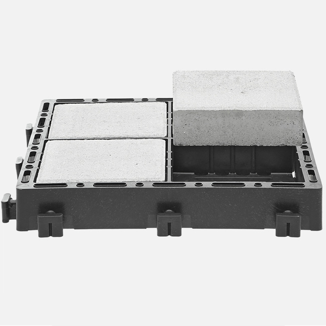 Dlažba ECORASTER Bloxx se vyplňuje betonovými nebo pryžovými bloky. Unikátní patentovaný drenážní systém zrychluje *přirozené vsakování vody mezi dlaždicemi. Vyznačuje se vysokou nosností i zatížitelností až 800 tun na 1 metr čtvereční, je tak vhodná pro nejtěžší techniku.