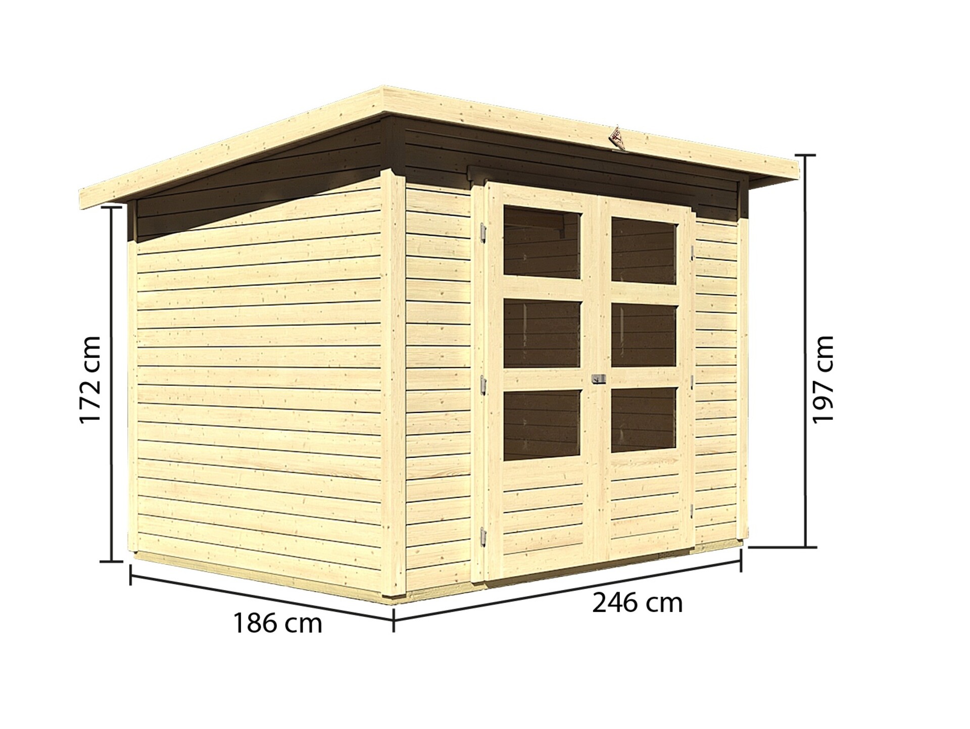 Základní model dřevěného domku pro vaši zahradu. Tento model má pultovou střechu a dvoukřídlé dveře na pantech s oknem v každém křídle. Stavebním materiálem domku jsou dřevěné profily síly 19 mm perfektně vyfrézované ze severského smrku.