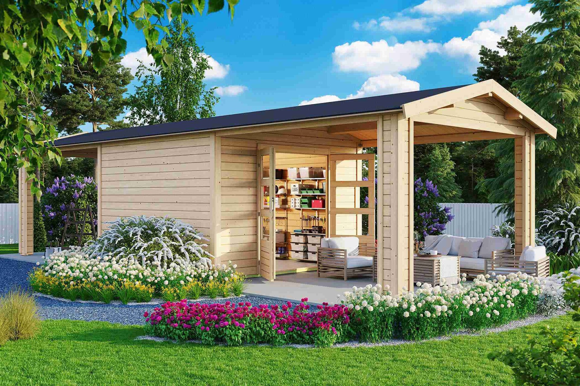 - Přírodní dřevo - před montáží musí být všechny stavební díly ošetřeny hluboko působícím základním nátěrem a preventivním nátěrem proti zamodrání a plísni, a to z vnější i vnitřní strany dílců. Pro konečný nátěr použijte i ve vnitřním prostoru povětrnostně odolnou lazuru s dobrými fyzikálními vlastnostmi, která ochrání dřevo proti vlhkosti a slunečnímu záření. Lazura by měla být zároveň voděodpudivá, světlostálá a vlhkosti odolná. Dbejte na to, aby lazura měla dostatek barevného pigmentu, protože jinak by mohlo dojít k zešednutí dřeva. Nepoužívejte žádný lak! Nechte si podrobně poradit od odborného prodejce barev, co se týká ochrany přírodního jehličnatého dřeva a dodržujte pracovní postup výrobce nátěrové hmoty. Další nátěr provádějte po dokonalém zaschnutí a vyvětrání. Důkladnou ochranou dřeva ovlivníte zásadně životnost zahradního domku. Povrchovou ochranu domku je nutné pravidelně opakovat a domek tak udržovat v dobrém stavu.