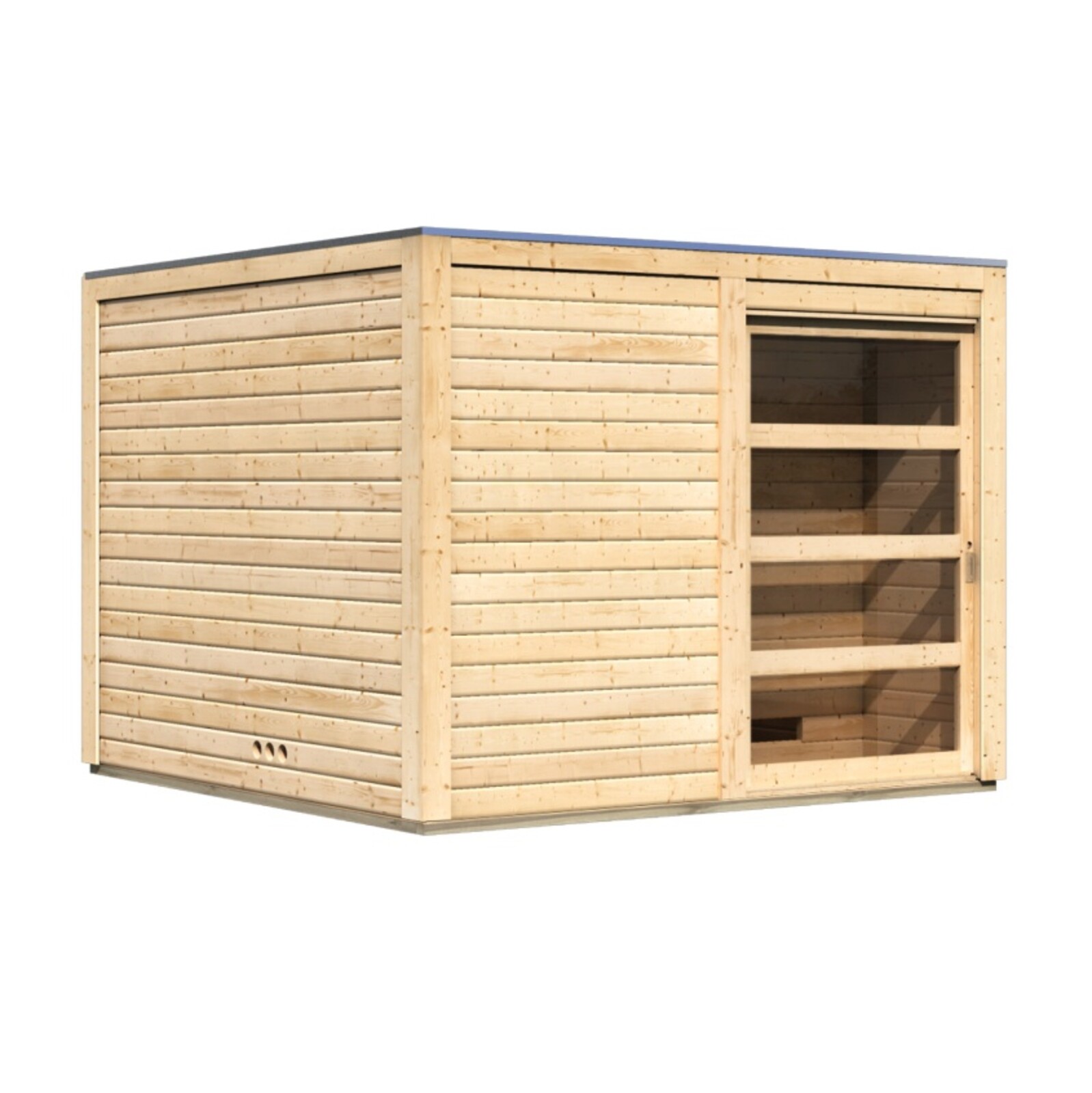 Venkovní model finské sauny pro vaši zahradu. Moderní design s chromovými rohovými lištami. Její výrobce, firma KARIBU HOLZTECHNIK z německých Brém, dokázala svými výrobky úspěšně navázat na staletou tradici skandinávského saunování a současně do ní zapracovat dnešní moderní technologie. Dodáváme jako stavebnici v rozloženém stavu, kde stěny tvoří jednotlivé dřevěné profily, které pouze sesadíte k sobě a sešroubujete, střechu tvoří celistvá deska. To garantuje jednoduchou montáž, kterou zvládne každý český kutil.