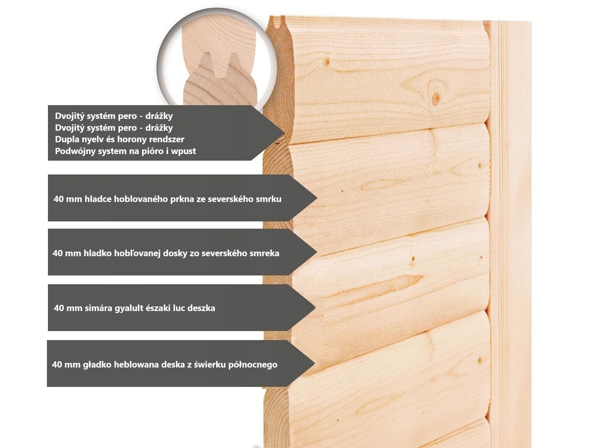 Sauna je celá vyrobena ze dřeva severského smrku v přírodním provedení. Dřevo pochází ze vzdáleného severu Evropy a je chemicky naprosto neošetřené (není ani namořeno ani nalakováno). V důsledku toho je prosté všech známých problematických látek, které by se v průběhu saunování mohly ze dřeva uvolňovat. Tato interiérová sauna je vyrobena z masivního dřeva síly 40 mm. Stěny sauny jsou složeny ze speciálně hlazených prken s dvojitým perem a drážkou, což garantuje neobyčejnou pevnost spoje.