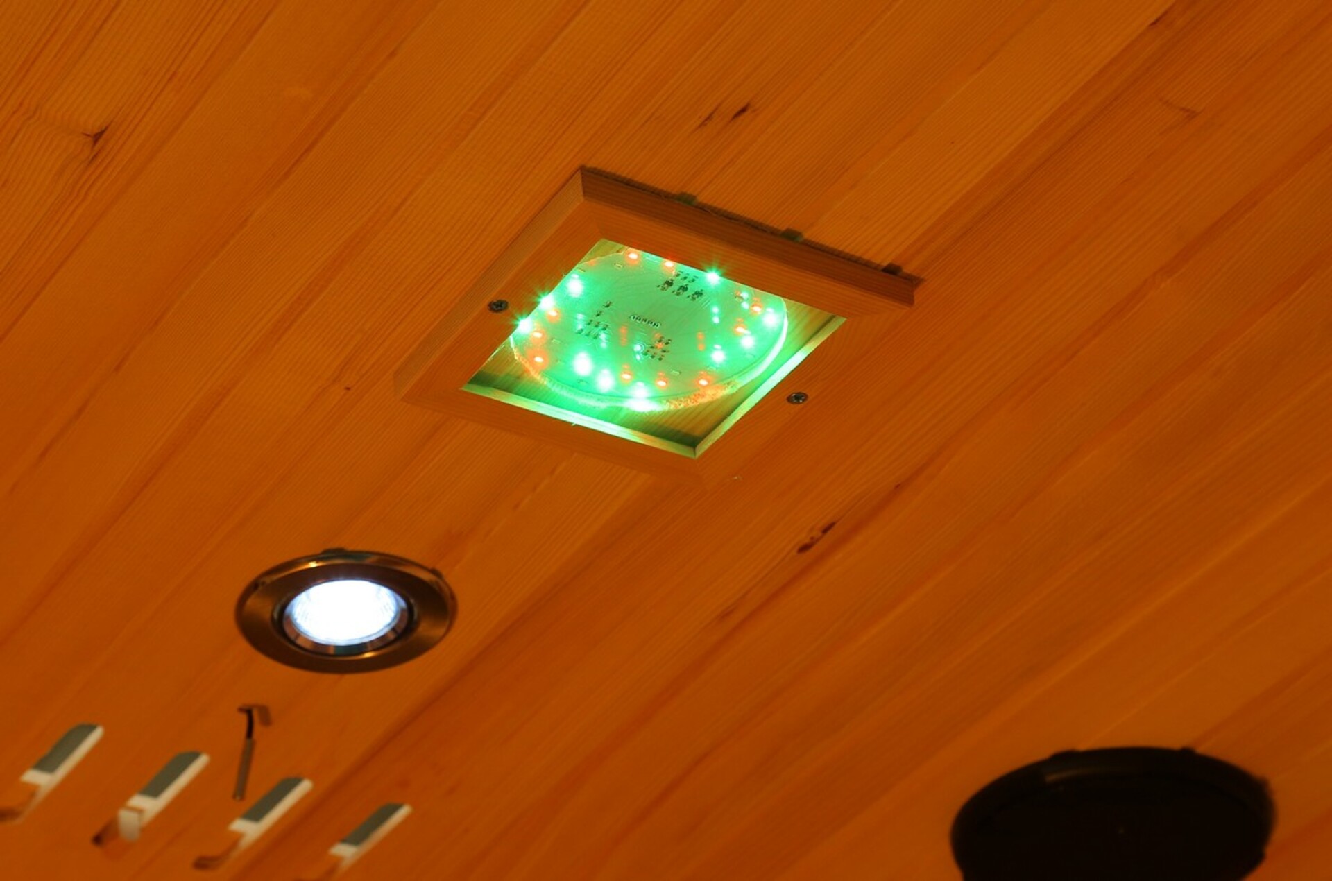 Barevná terapie: Infrasauna disponuje osvětlením s měnícími se barvami. Celkem 7 barevných kompozic, mezi nimiž si můžete vždy vybrat, která Vám bude osvětlovat interiér. Jak všichni víme, jednotlivé barevné frekvence mají svůj blahodárný účinek na lidský organismus.