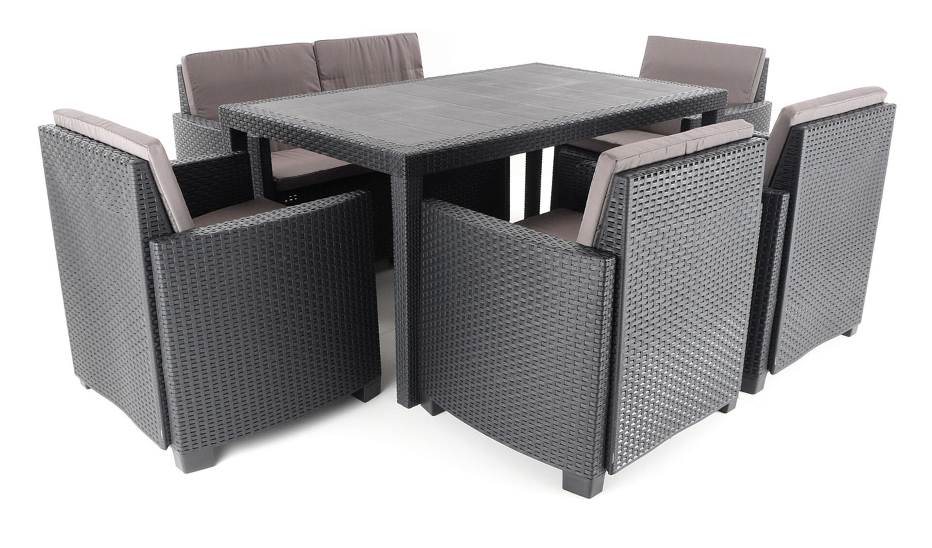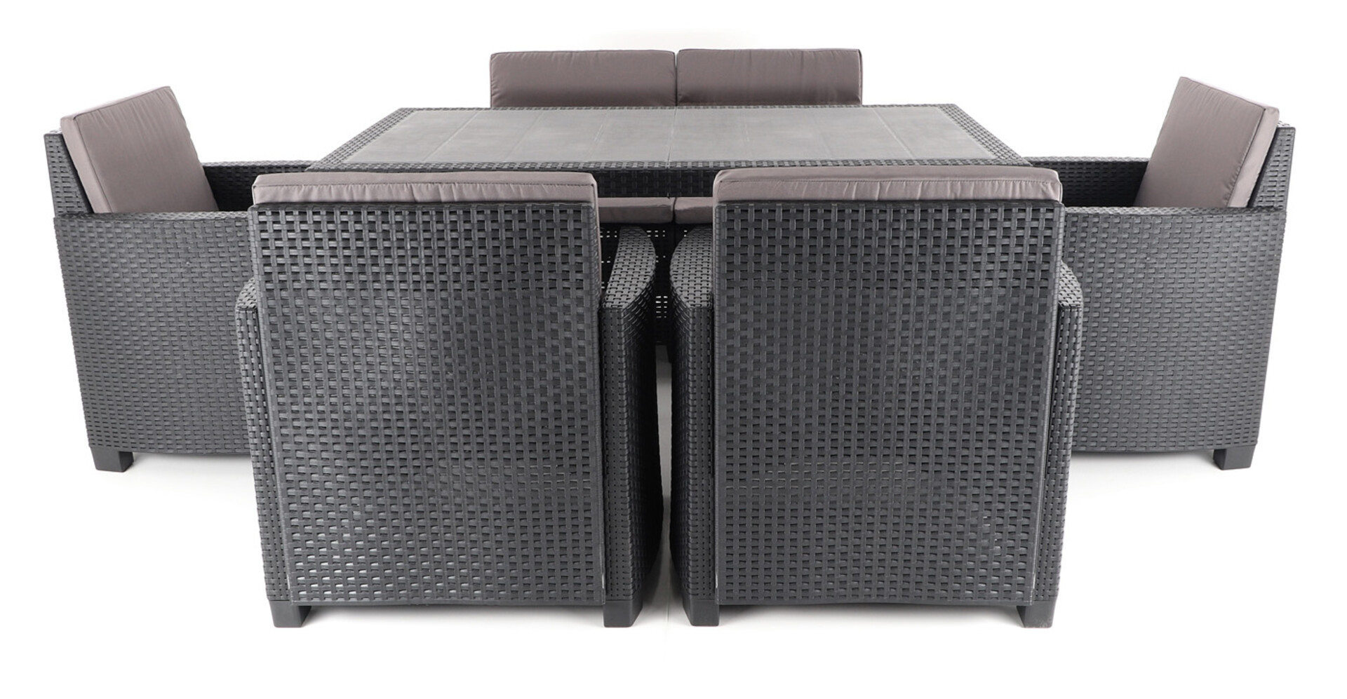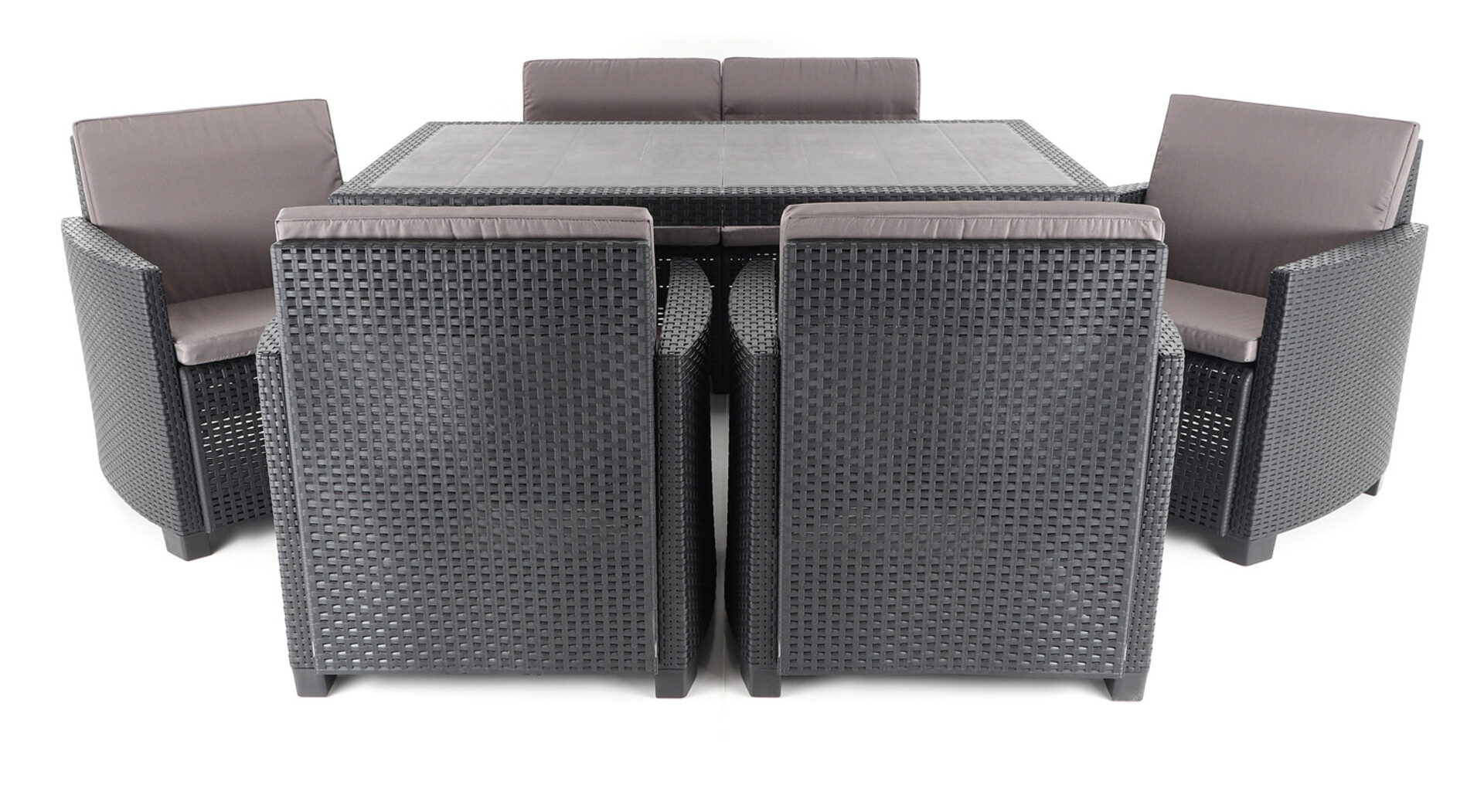 Stolová sestava se skládá ze 6 pohodlných křesel a stolu v imitaci umělého ratanu s UV filtrem.