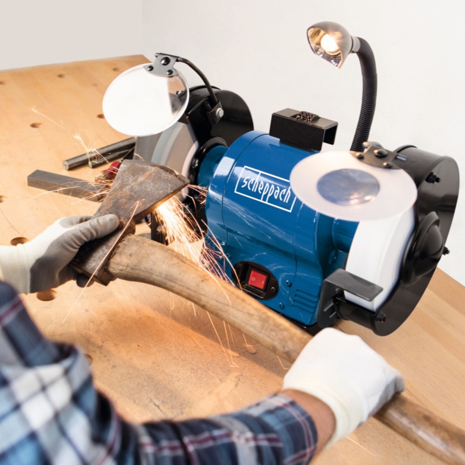 Velké sklopné průhledné kryty, které chrání vaše oči, jsou vyrobeny z kvalitního materiálu eliminujícího zkreslení, takže máte vždy perfektní přehled o broušeném nástroji. Opěrky nástrojů jsou nastavitelné a díky nim výrazně prodloužíte životnost celého brusného kotouče. Nezbytným doplňkem při broušení je výborné osvětlení pracovní plochy.