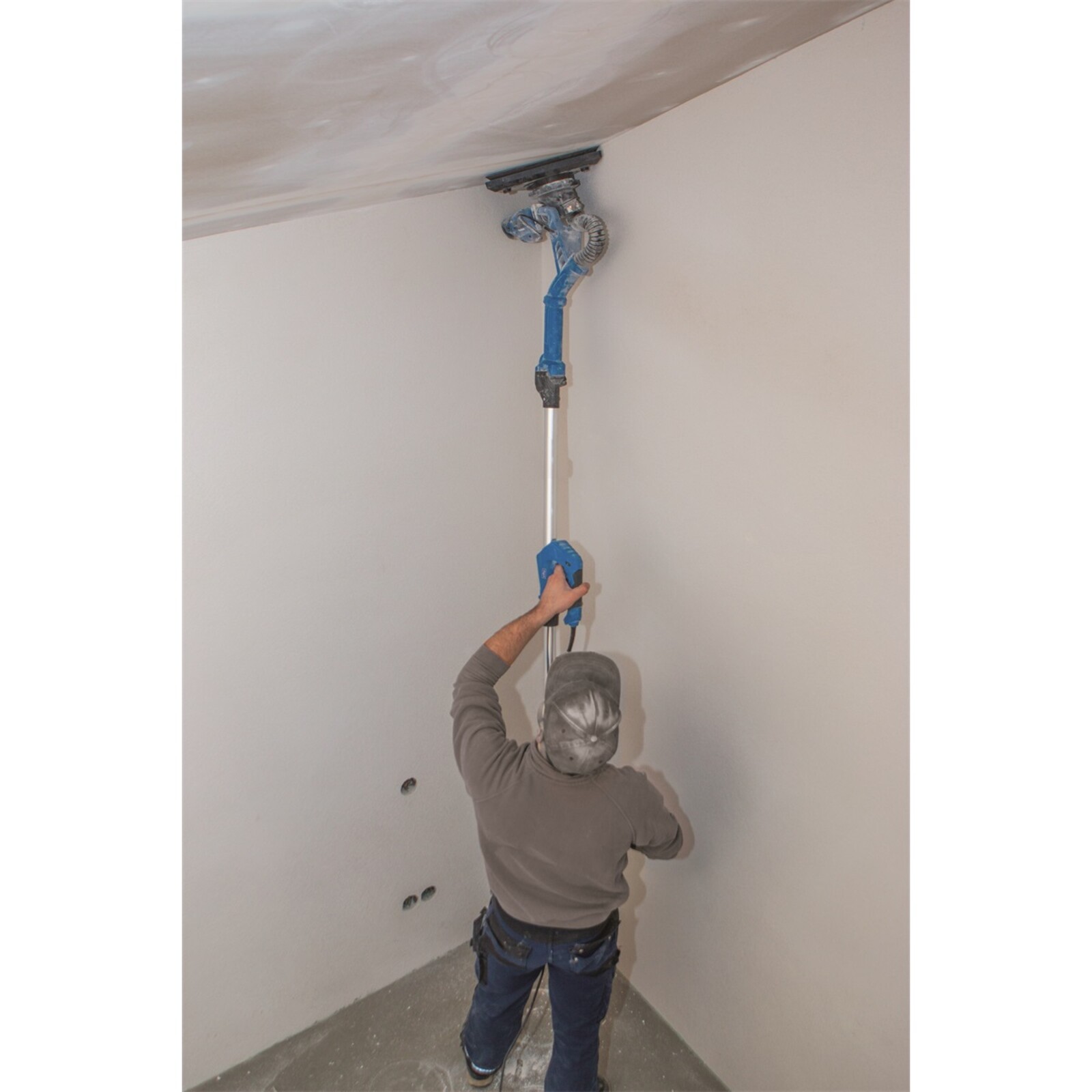 Abyste dosáhli až ke stropu nebo do špatně přístupných míst, je bruska vybavena výkyvnou hlavou, prodlužovací teleskopickou rukojetí, díky které se dá délka stroje nastavit v rozmezí od 140 do 165 cm a další trojúhelníkovou hlavou, která je ideální pro práci u stěn a v rozích. V tmavých koutech Vám usnadní práci i integrované LED osvětlení. Výměna brusného papíru pomocí systému suchého zipu je velmi jednoduchá a rychlá. Ergonomický tvar brusky a měkčené protiskluzové zóny držadla umožňují pohodlnou práci po dlouhou dobu.