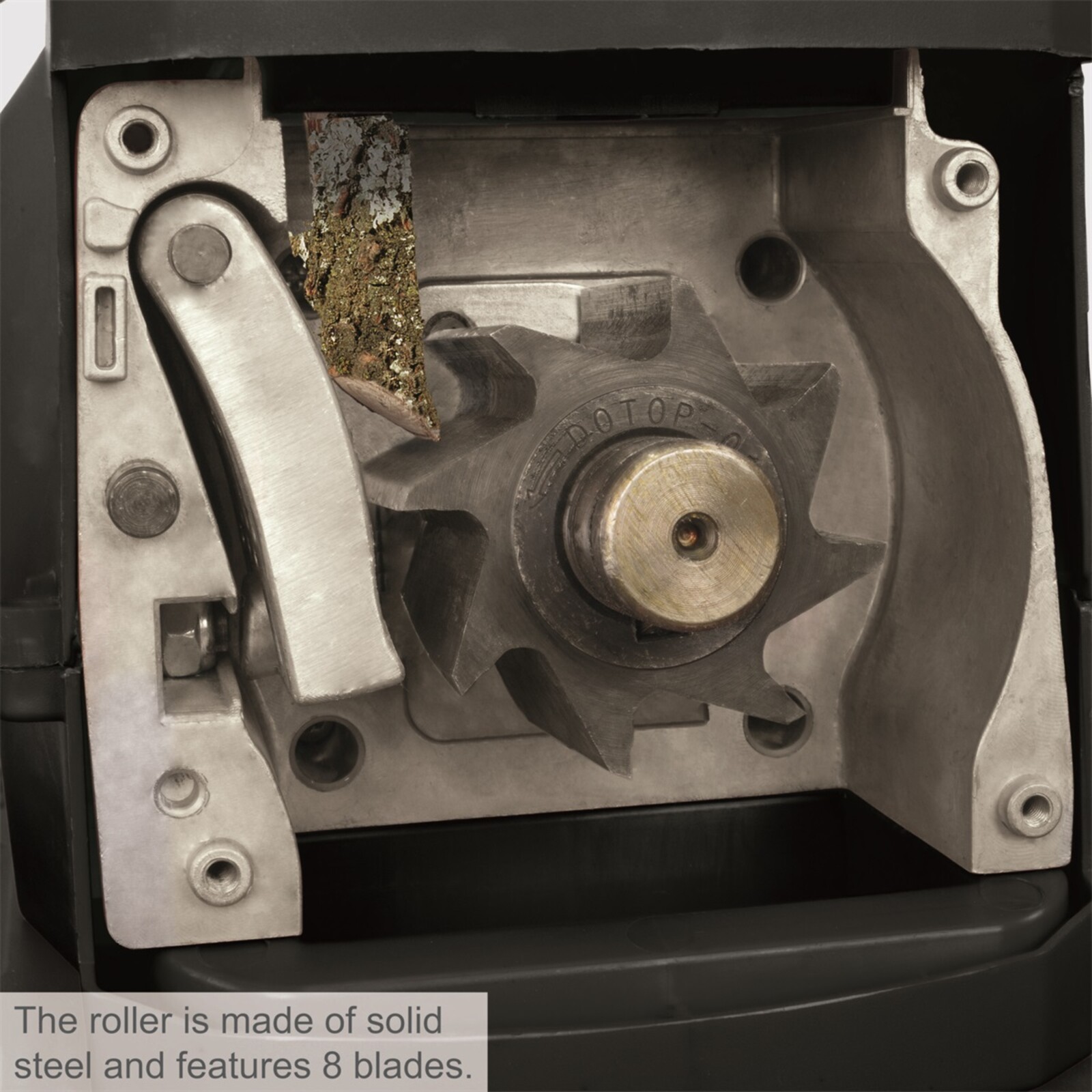 Základem výkonného drtícího ústrojí je pomaloběžný drtící válec, který je pro delší životnost uložen v pevném kovovém bloku. Ozubený válec si sám vtahuje větve do vnitřku ústrojí, což je velmi pohodlné.