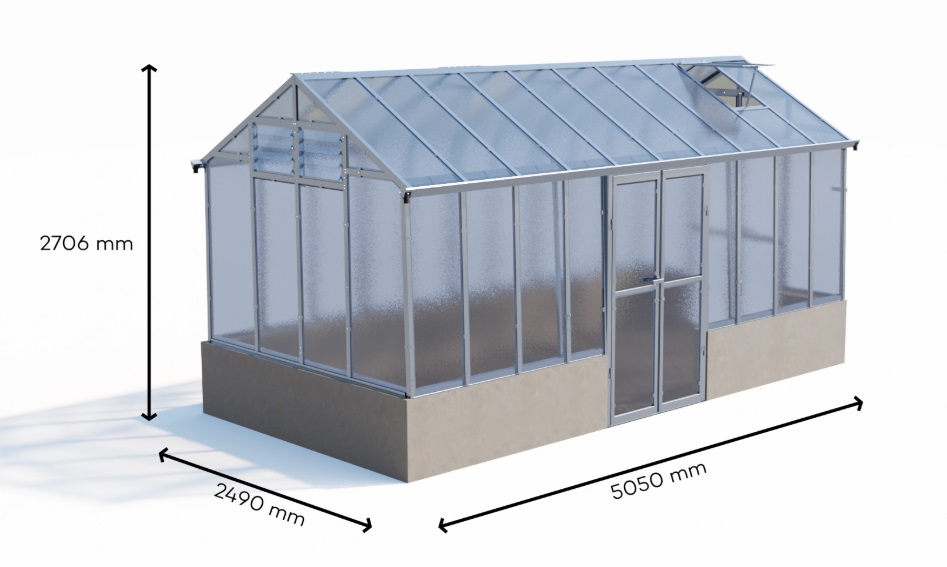 Skleník s žárově zinkovanou plechovou konstrukcí, š.2,49 m, d.5,05 m, 1x dvoukřídlové dveře 190x105 cm usazené do boční stěny a 1x dvoukřídlové dveře 190x105 cm v čelní stěně jsou zapuštěny o 60 cm do základu. V druhém čele lamelové větrací okno s automatickým otvíračem. Na místo plechových výztuh jsou výztuhy jeklové, umožňující osazení težších polic či stolů. Součástí balení je sada okapů se svody a hadicemi na obě strany skleníku.
