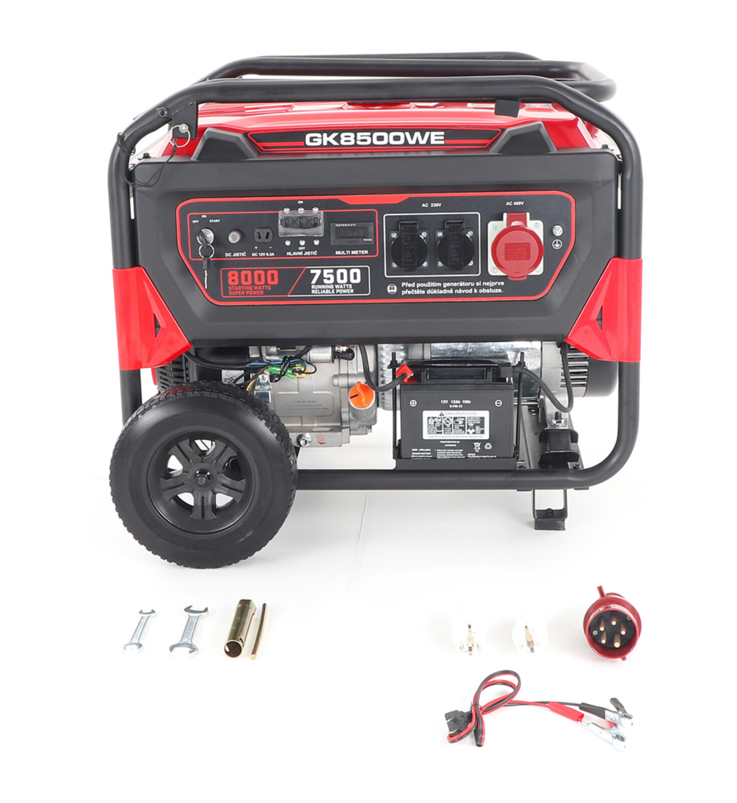 Příslušenství: nabíjecí kabely, klíč na svíčku, klíč,2 x zástrčka 220 V samec , 1 x 400 V samec