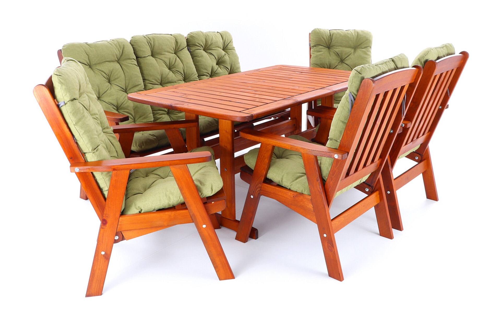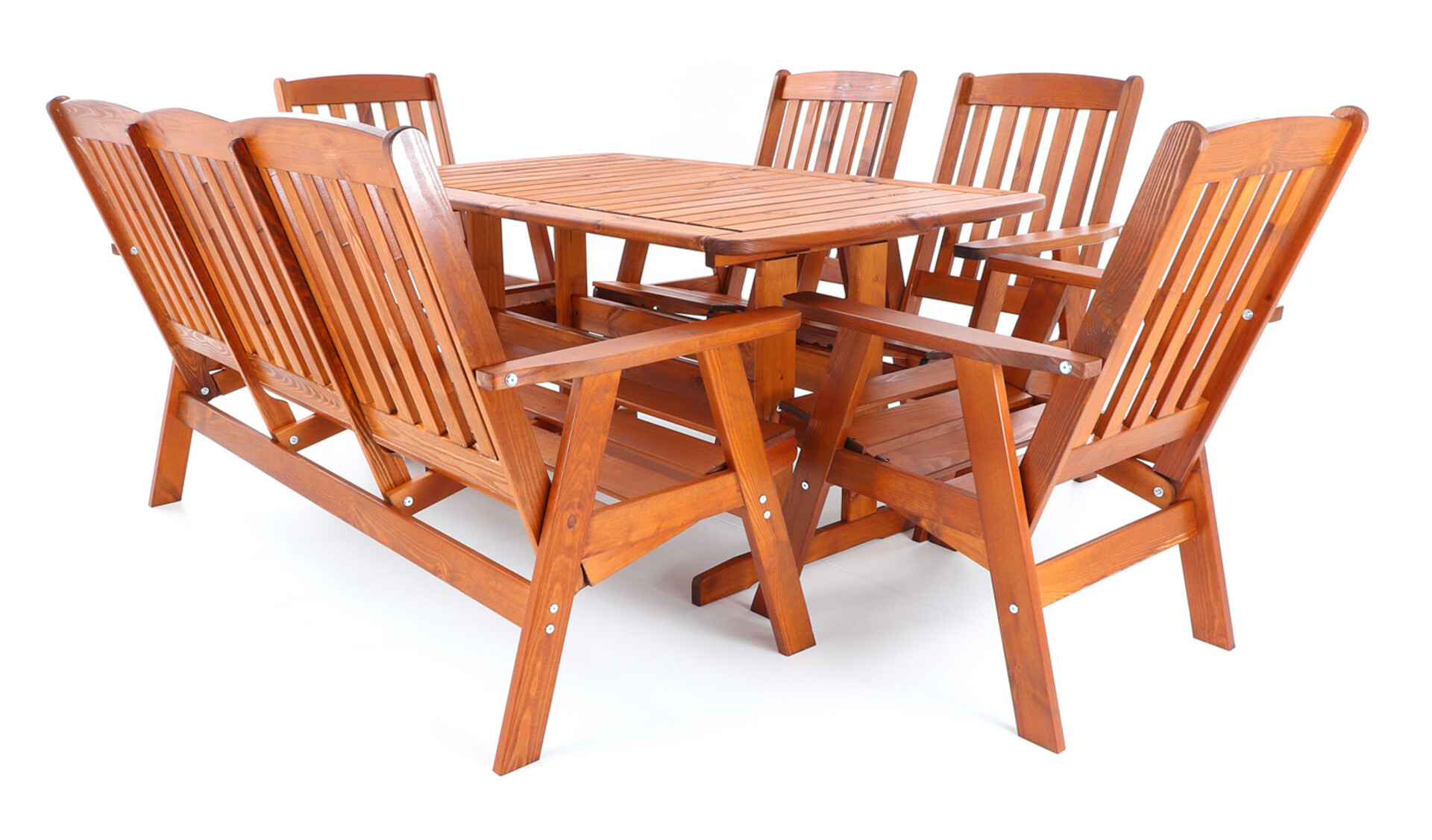 Luxusní masivní stolová sestava čtyř polohovacích křesel, jedné polohovací lavice a stolu z odolného a trvanlivého dřeva severské borovice. Odolné dřevo a velmi robustní konstrukce řadí tuto sestavu mezi nejmasivnější výrobky ve své kategorii na trhu.