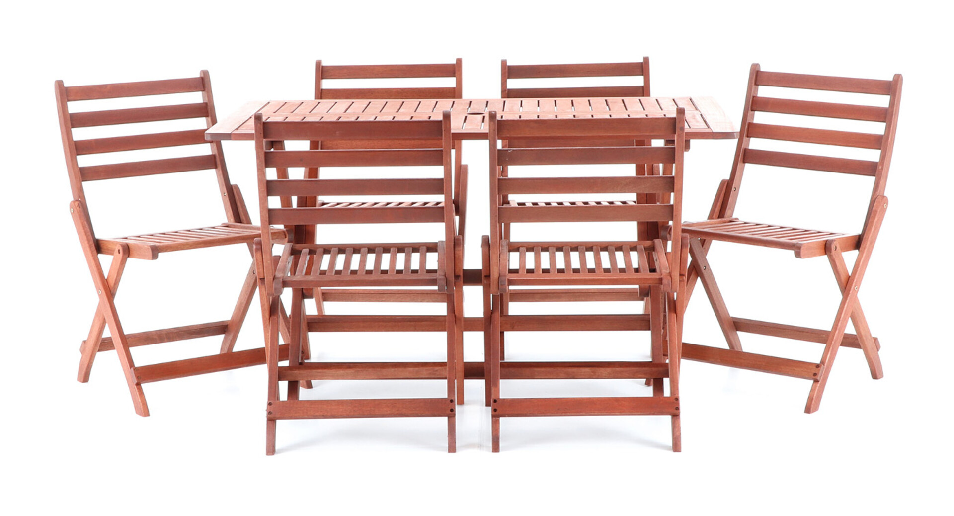 Masivní stolová sestava 6-ti skládacích židlí a skladacího stolu z exotického, velice trvanlivého a tvrdého dřeva Meranti. Určeno do exteriérů, interiérů.