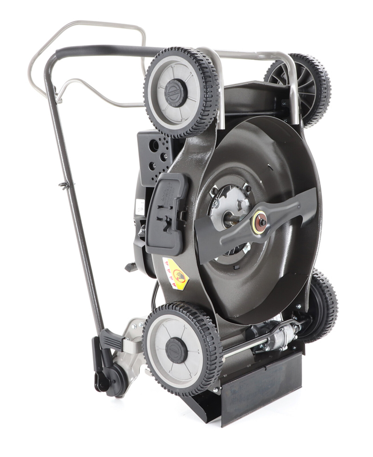 Novinkou sekačky je funkce tzv. 'CHYTRÉ ŘEŠENÍ', sekačku lze pro ekonomické uskladnění, snadné čištění, servisování otočit a postavit na zadní speciální patky šasí, tímto se snadno dostanete na spodní část žacího ústrojí, uložení náprav a převodovku.