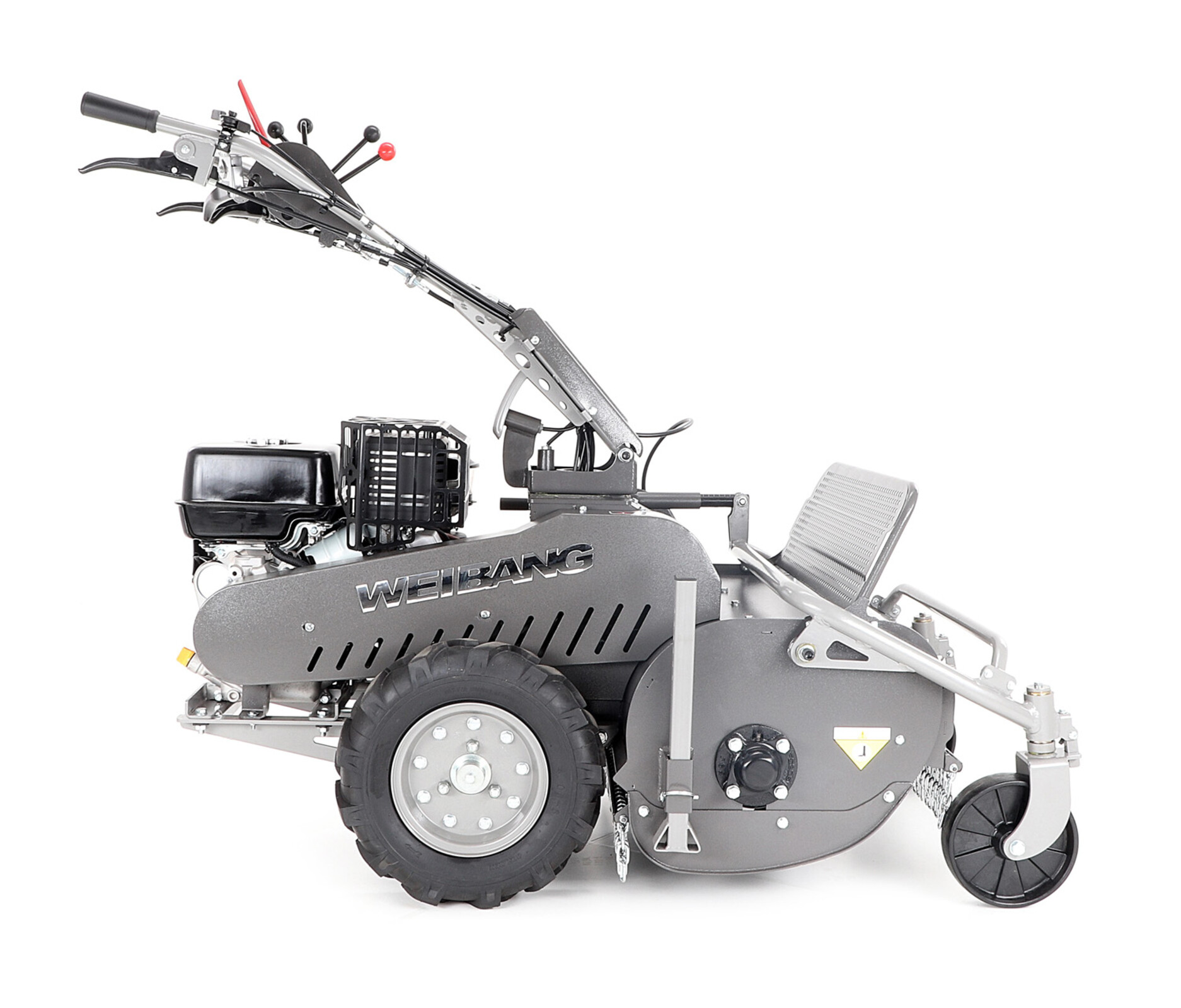 Snadný pohyb v terénu usnadní nejen kola s hrubým dezénem, ale i pojezd s CVT Weibang převodovkou. Přední kola uložená na otočných čepech dávají sekačce skvělou manévrovatelnost.